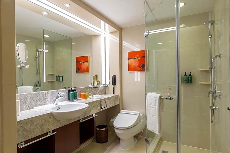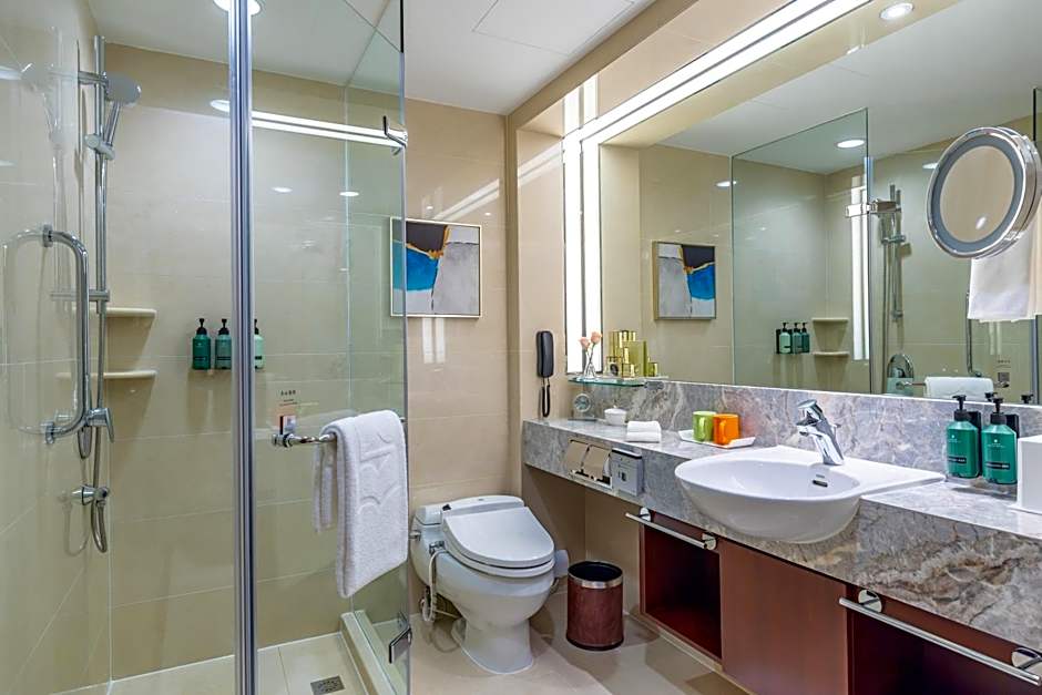 Spacious room features views of Dalian city. It will offer an indulgent bed with cotton linens. The private bathroom comes with a bathtub and branded bathroom amenities.